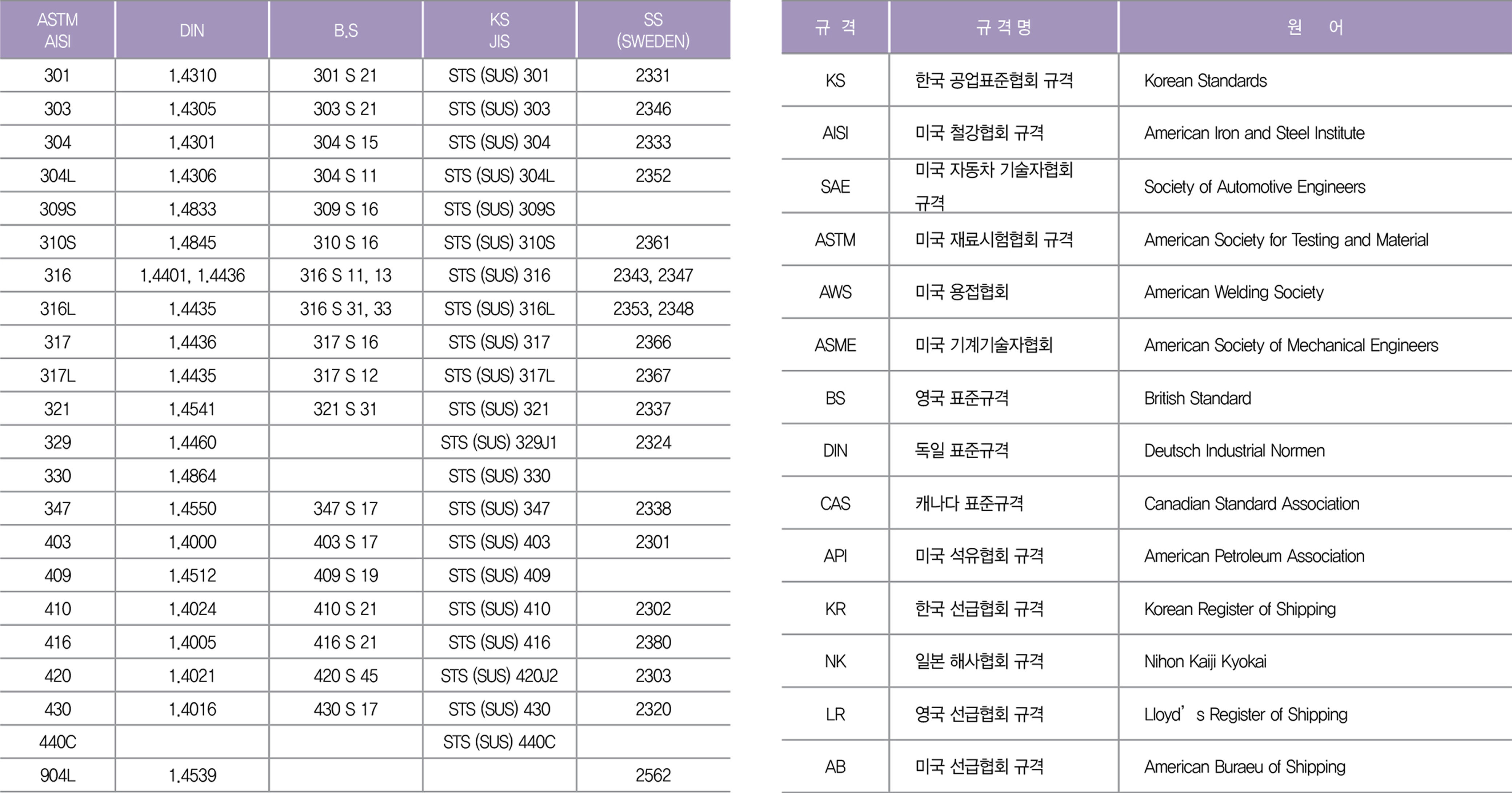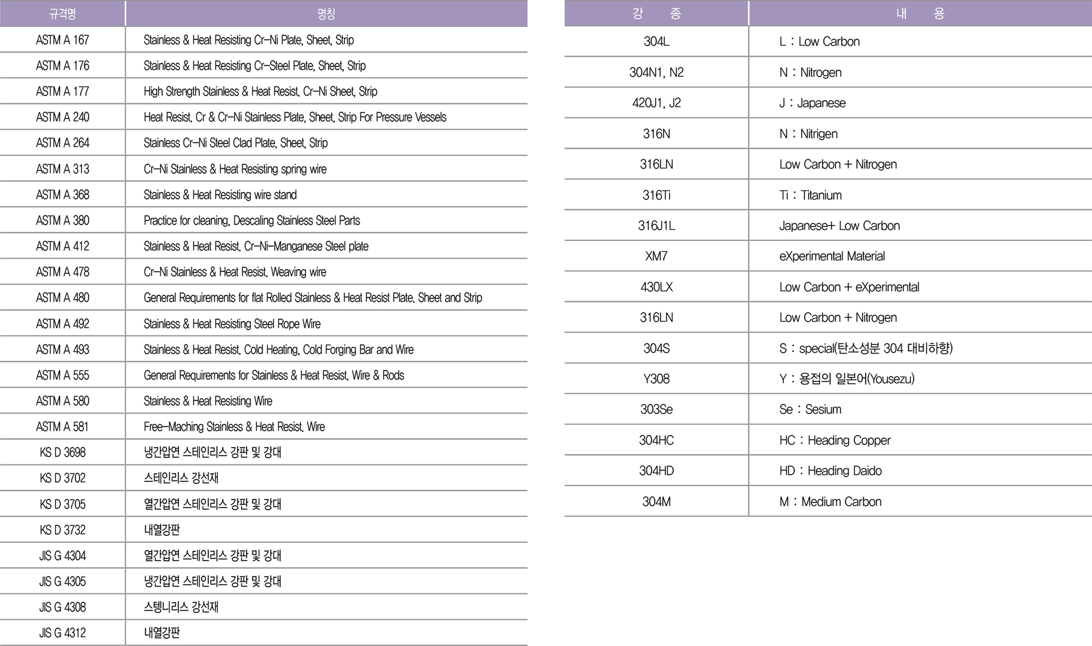 스테인리스 관련 규격목록 / 약어 설명